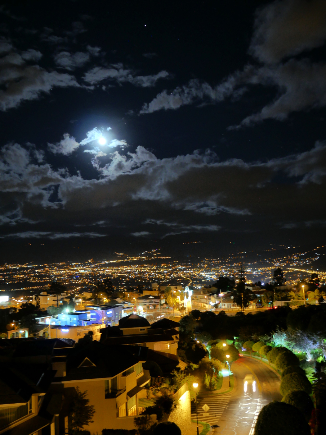 Blick vom Dach unseres Wohnhauses in Miravalle (Cumbayá). Der größere Stern am oberen Bildrand fast in der Mitte ist Mars.