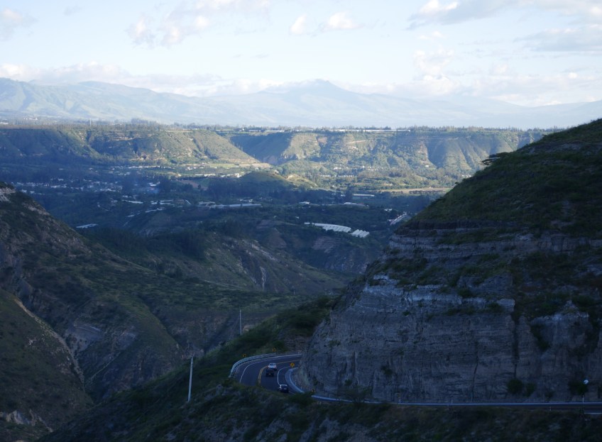 Panamericana am Tal des Rio Pisque und Vulkan (bei Quito)